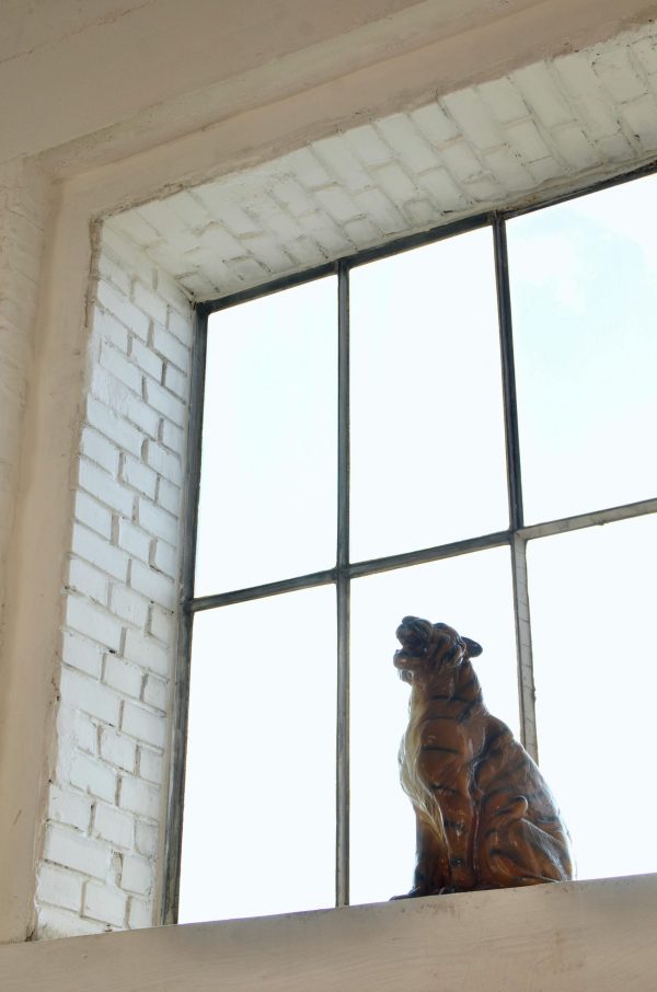 Sunlight floods the loft, painting the raw brick walls in a warm, inviting glow. Perched majestically on the wide window
