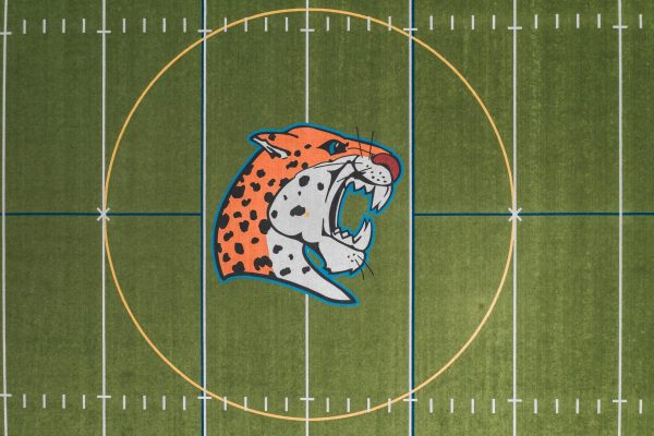 Soar above the gridiron and witness a breathtaking perspective: a crisp, high-resolution drone shot of a vibrant football field. The