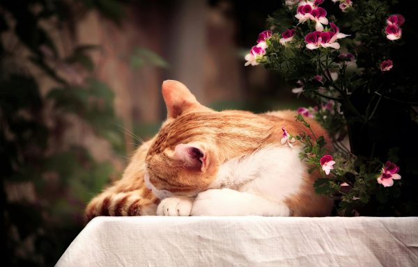 Ginger cat sleeping on a table surrounded by vibrant flowers in a peaceful outdoor setting.